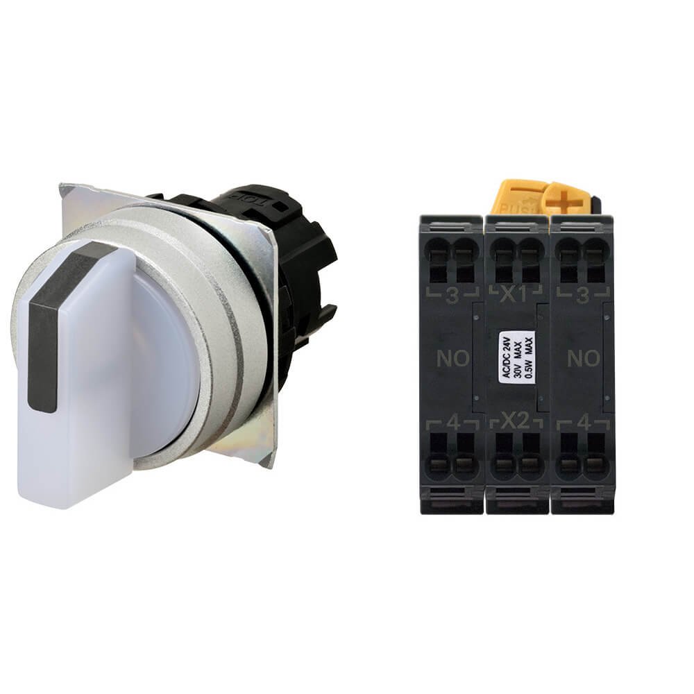 A22NW-3MM-TWA-P101-WC – Selector A22NW Ø22, 3 position, Lighted, bezel brushed M, MANUAL, COLOR WHITE, LED WHITE, 2NO, 24 VDC, push-in terminal