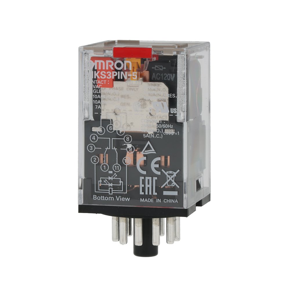 MKS3PIN-5 120VAC – Relay, plug-in, 11-pin, 3PDT, 10A, mech & LED indicator, test button