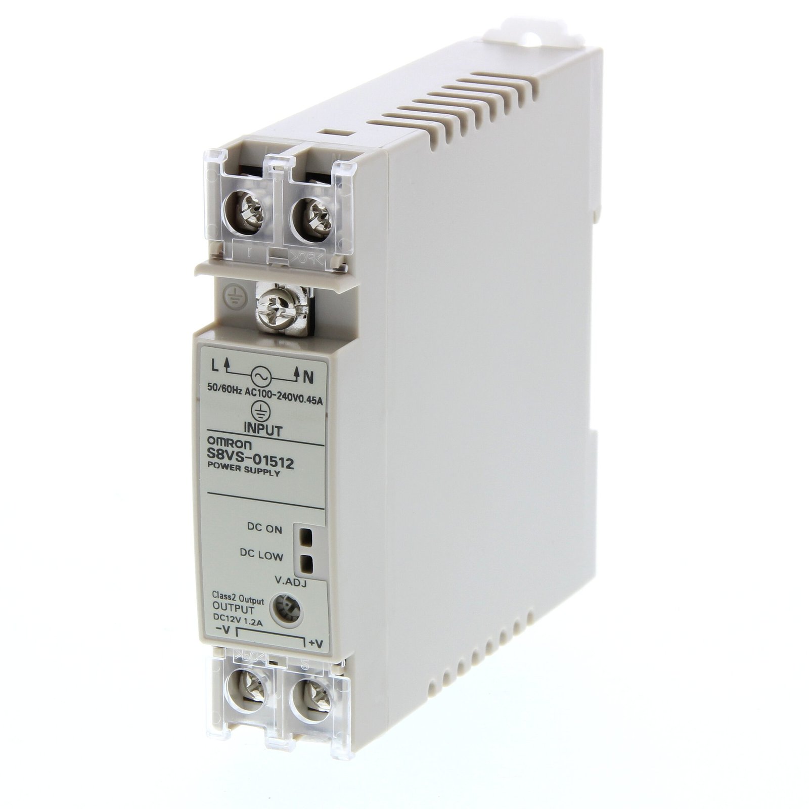 S8VS-01512 – Power supply, plastic case, 22.5 mm wide DIN rail or direct panel mounting, 100/240 VAC supply, 15 W, 12 VDC, 1.2 A output